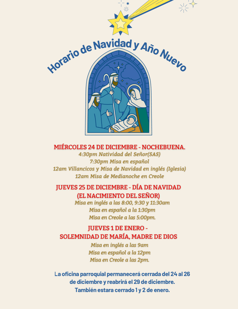 Sunday: 8:00 AM, 9:30 AM, 11:30 AM, 1:30 PM (Spanish), & 5:00 PM (Creole)